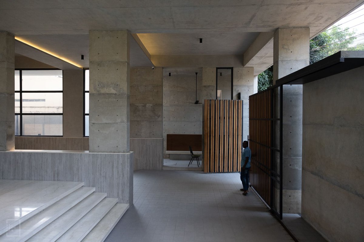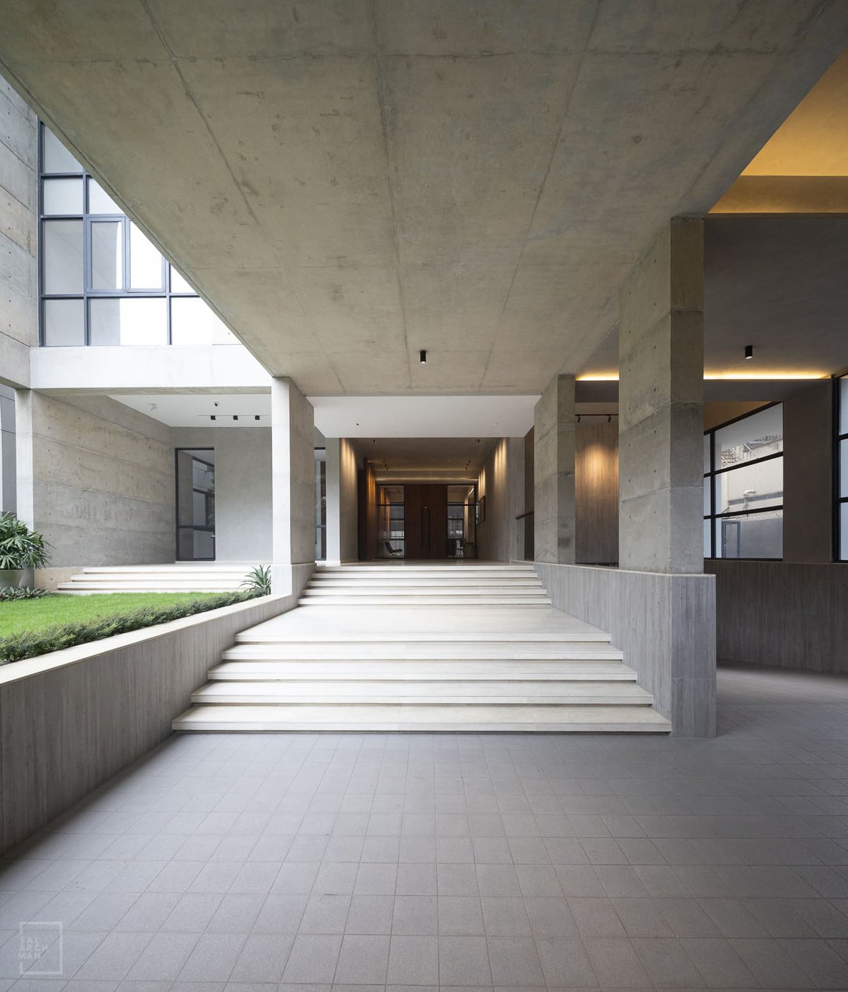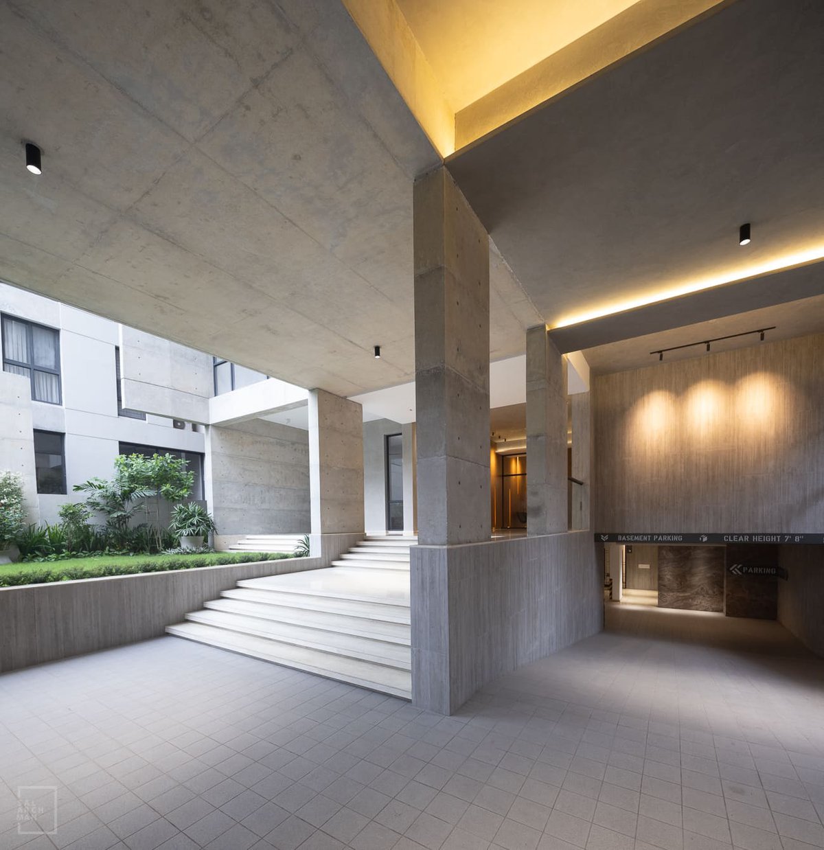 The fair-faced building is conceptualized from aesthetic vertical and horizontal planes that harmoniously knit the building blocks with the green chunks generating visual green axes from the lawn at ground levels to green terraces at upper levels. The interplay of these planes and geometrically frames the privacy at sideways yet assuring the optimum openness. Each floor comprises a typical interior flawlessly segregated by the service and served zones with hassle-free circulation. These zones intricately channels ample air ventilation internally. The interior of brown and grey hues coupled with the invigorating warm lights and optimized illuminations sync thermal comfort and visual ease.