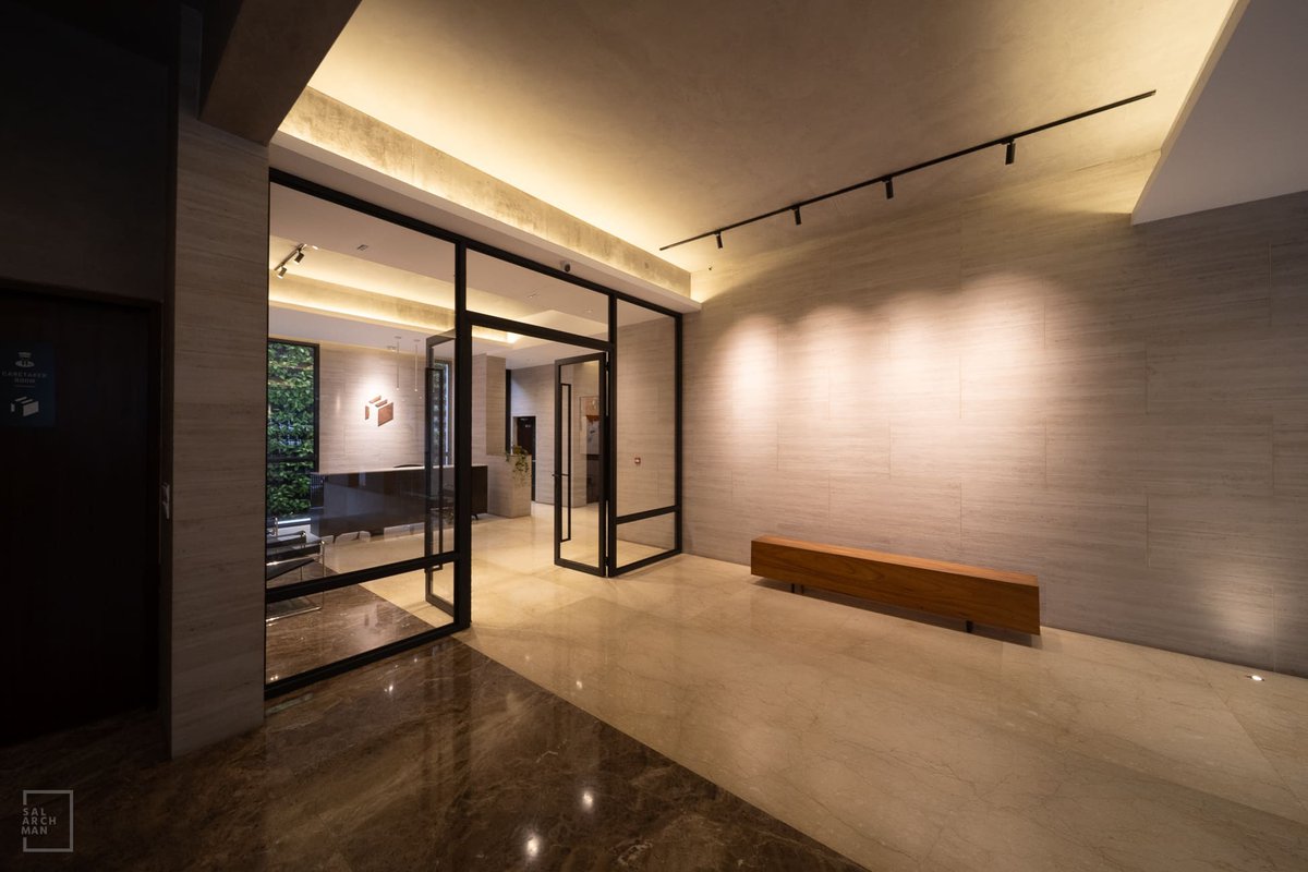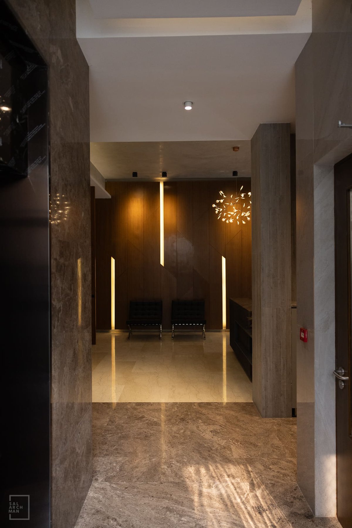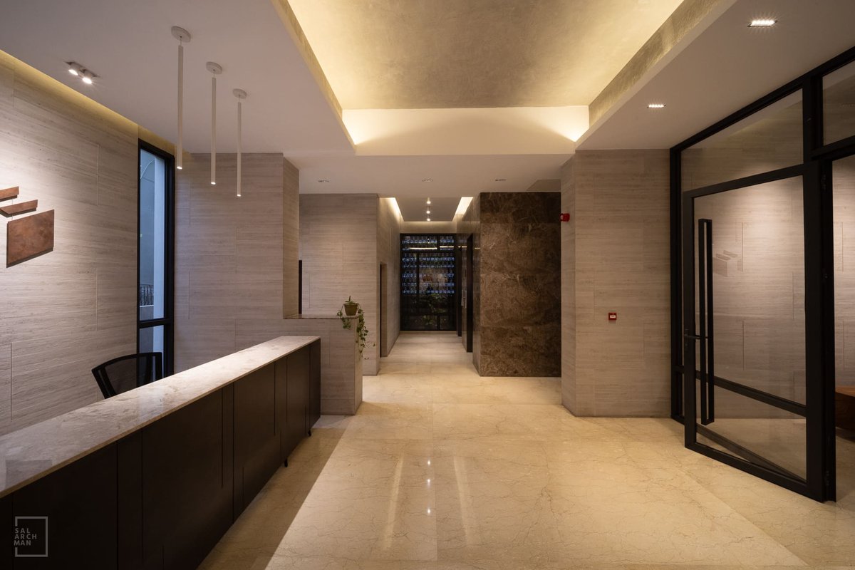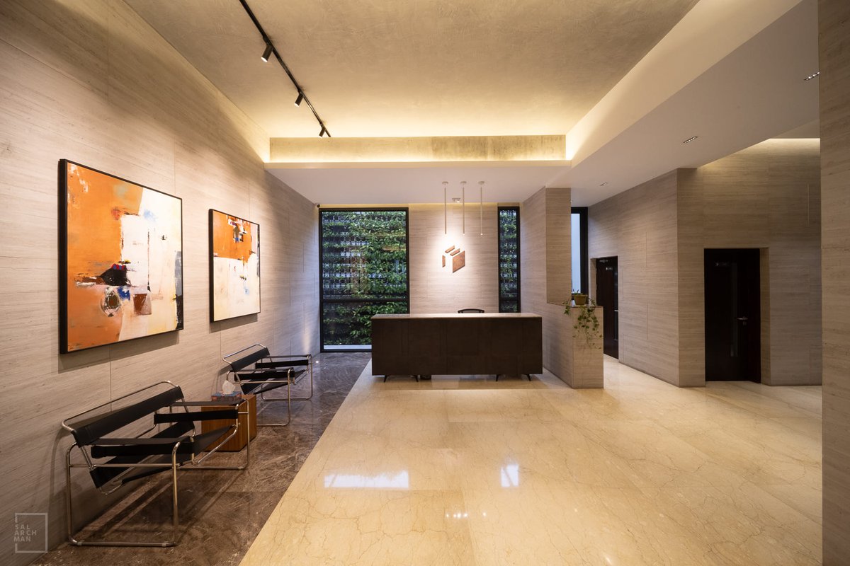 The fair-faced building is conceptualized from aesthetic vertical and horizontal planes that harmoniously knit the building blocks with the green chunks generating visual green axes from the lawn at ground levels to green terraces at upper levels. The interplay of these planes and geometrically frames the privacy at sideways yet assuring the optimum openness. Each floor comprises a typical interior flawlessly segregated by the service and served zones with hassle-free circulation. These zones intricately channels ample air ventilation internally. The interior of brown and grey hues coupled with the invigorating warm lights and optimized illuminations sync thermal comfort and visual ease.