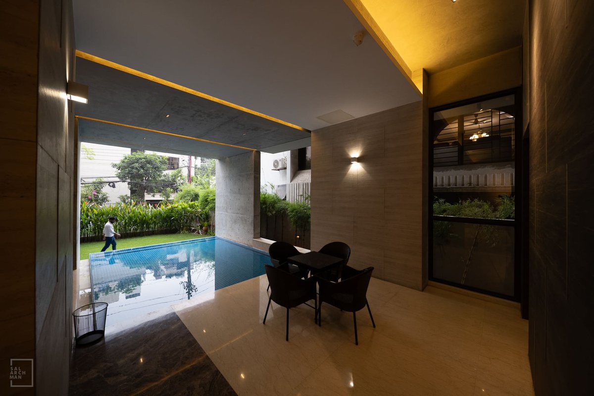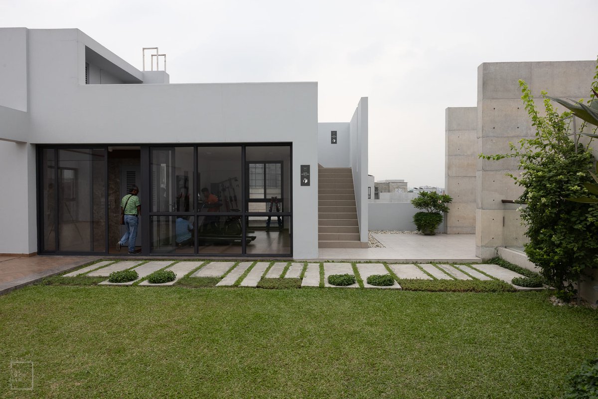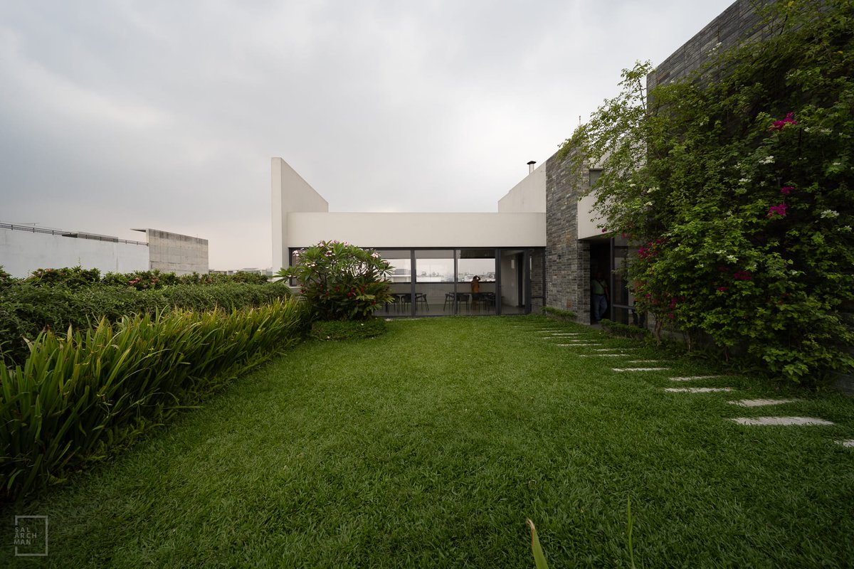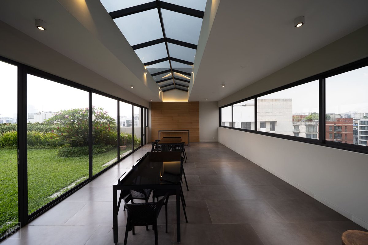 The roof features substantial lush roof garden, outdoor seating and semi-indoor space absorbs the excessive heat. The glass bricks at the top of stair invigorate playful and textured light into the stairways.Sleek fenestrations between planes and verandahs peel the naturally lit and ventilated spaces.