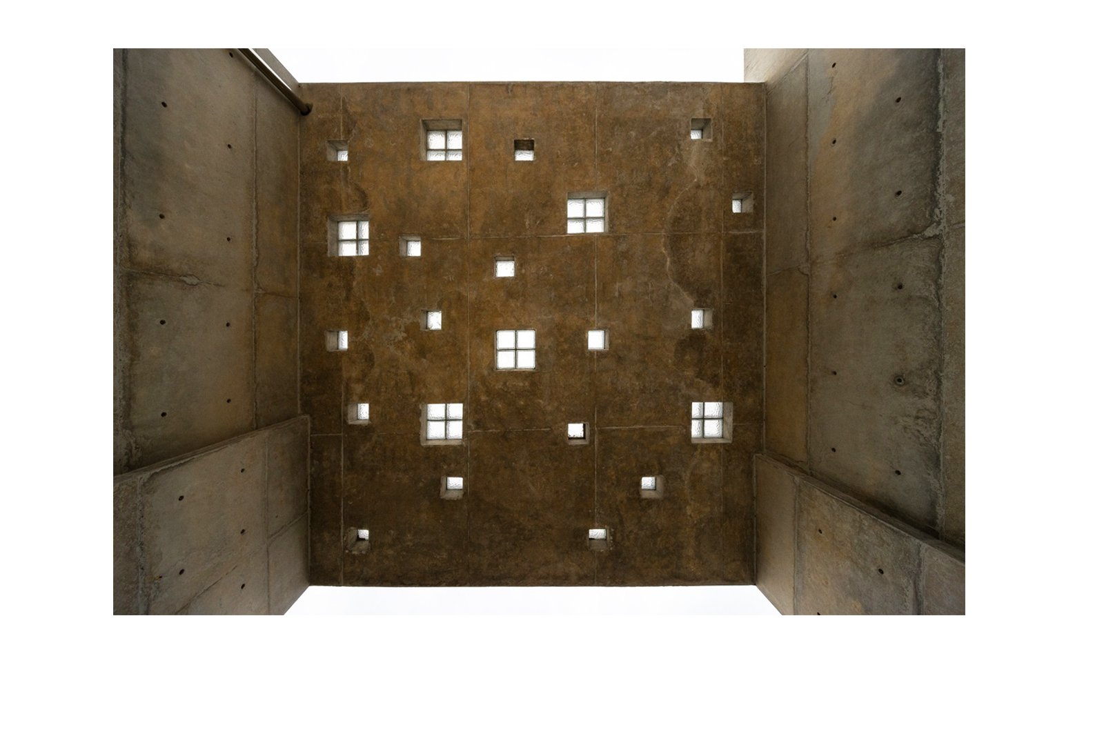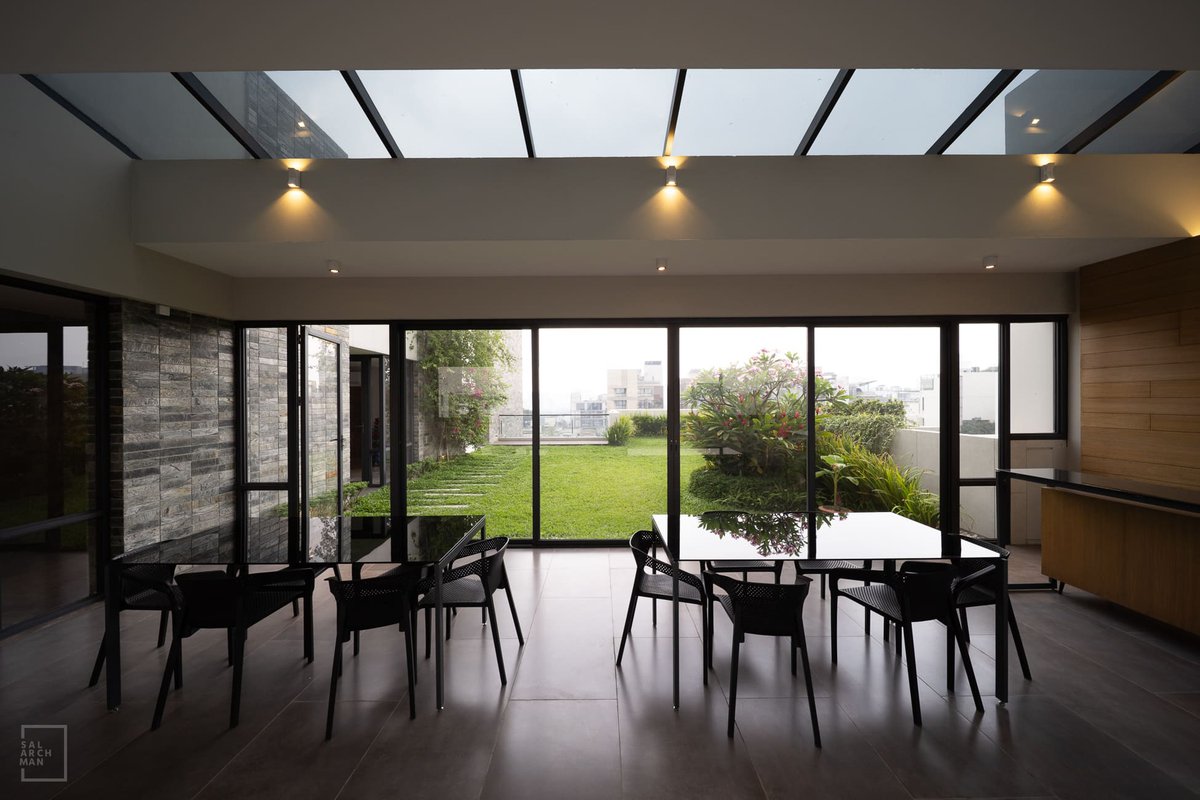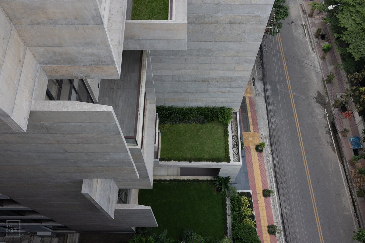 The roof features substantial lush roof garden, outdoor seating and semi-indoor space absorbs the excessive heat. The glass bricks at the top of stair invigorate playful and textured light into the stairways.Sleek fenestrations between planes and verandahs peel the naturally lit and ventilated spaces.